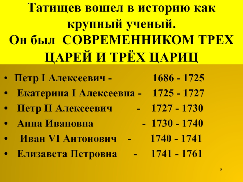 Слайд 8Татищев вошел в историю как крупный ученый.