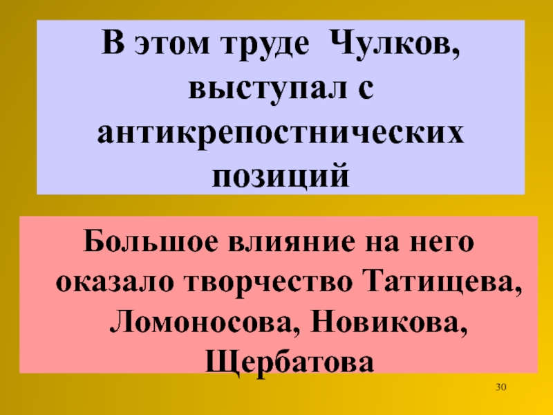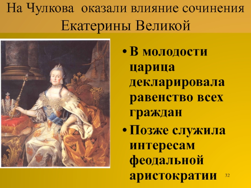 Слайд 32На Чулкова оказали влияние сочинения Екатерины Великой