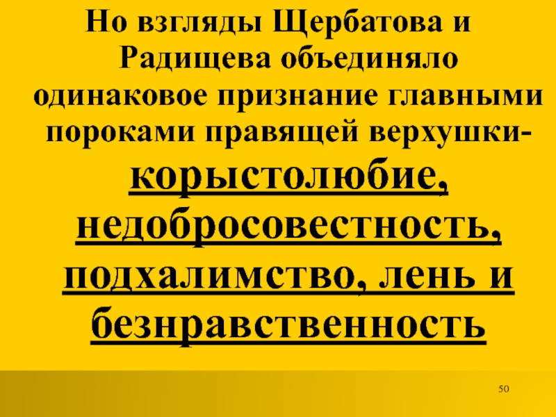 Слайд 50Но взгляды Щербатова и Радищева объединяло одинаковое признание главными пороками