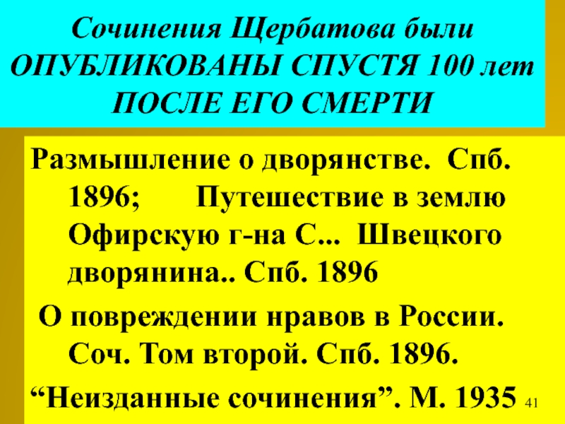 Слайд 47Сочинения Щербатова были ОПУБЛИКОВАНЫ СПУСТЯ 100 лет ПОСЛЕ ЕГО СМЕРТИ