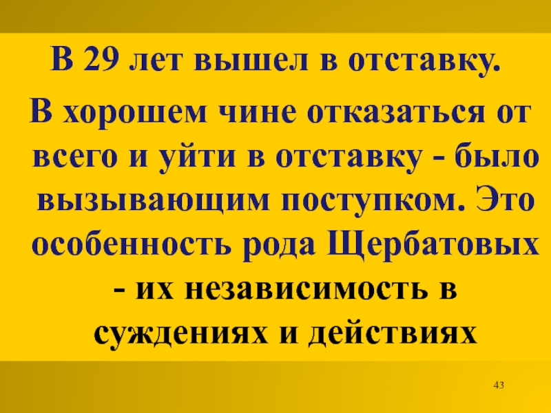 Слайд 43В 29 лет вышел в отставку.