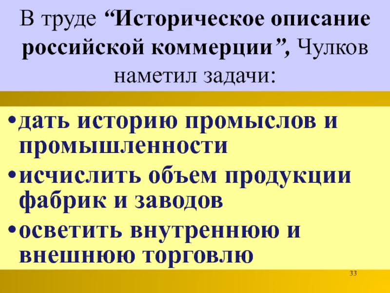 Слайд 33В труде “Историческое описание российской коммерции”, Чулков наметил задачи: