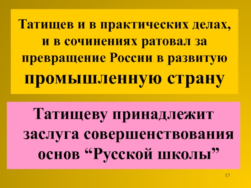 Слайд 17Татищев и в практических делах, и в сочинениях ратовал за
