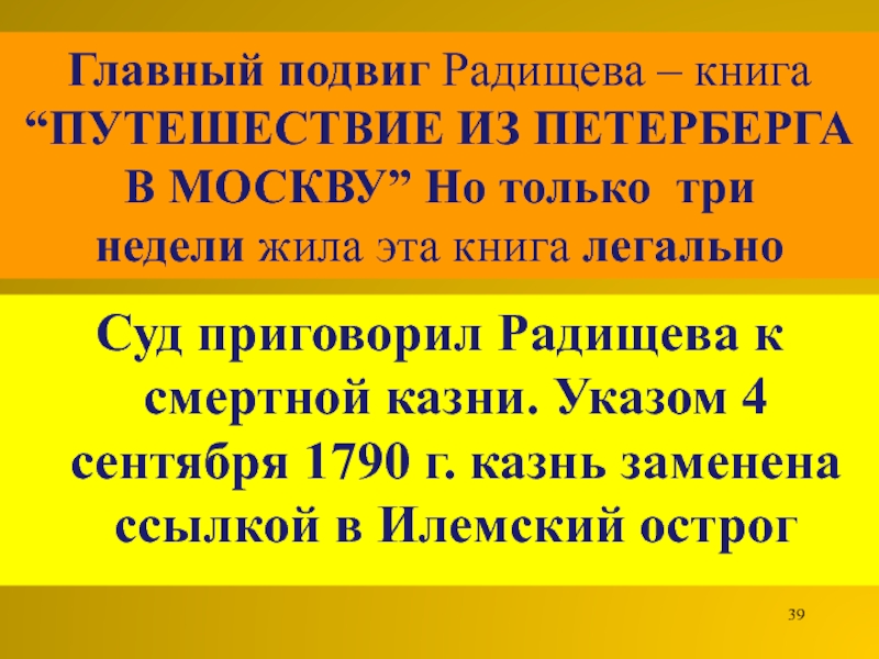 Слайд 39Главный подвиг Радищева – книга “ПУТЕШЕСТВИЕ ИЗ ПЕТЕРБЕРГА В МОСКВУ”