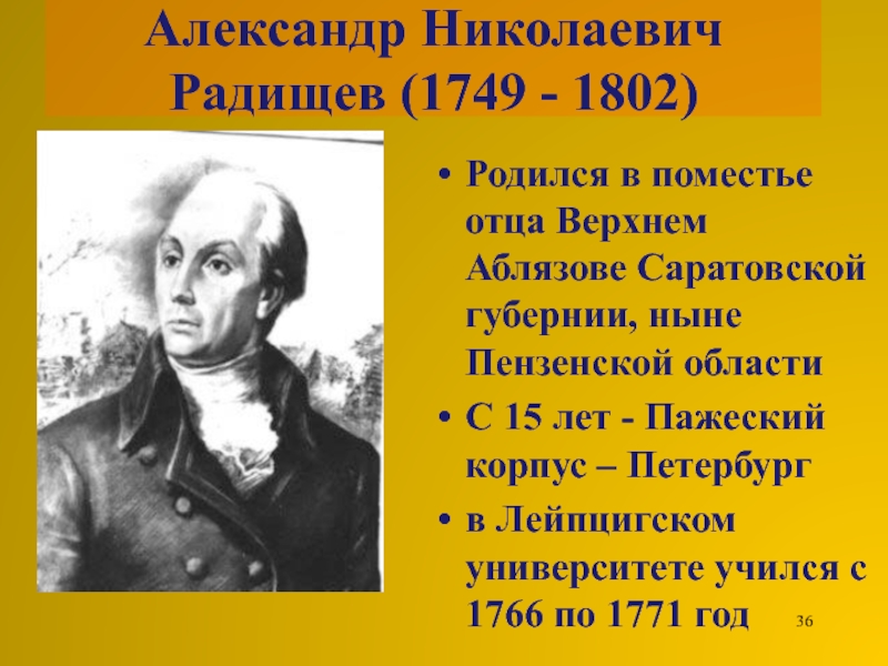 Слайд 36Александр Николаевич Радищев (1749 - 1802)