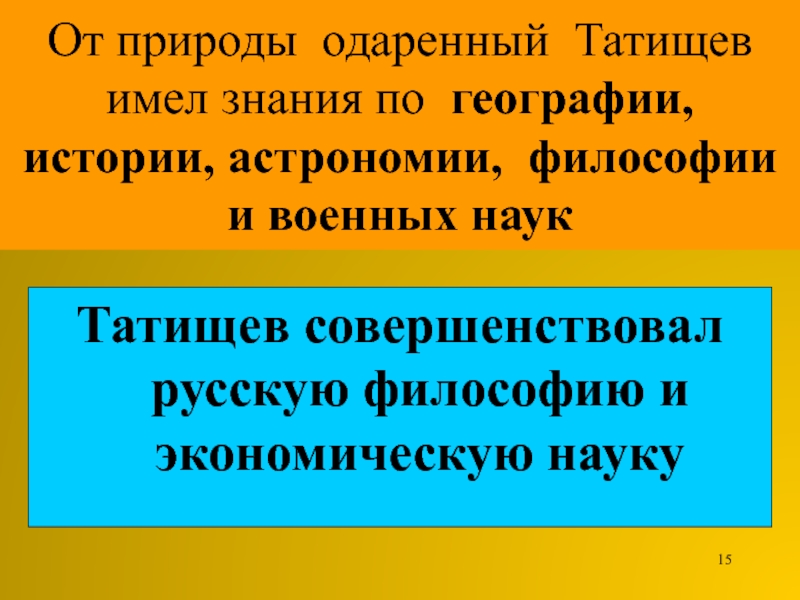 Слайд 15От природы одаренный Татищев имел знания по географии, истории, астрономии,