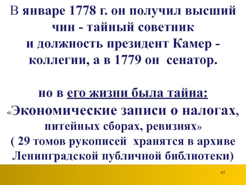 Слайд 45В январе 1778 г. он получил высший чин - тайный