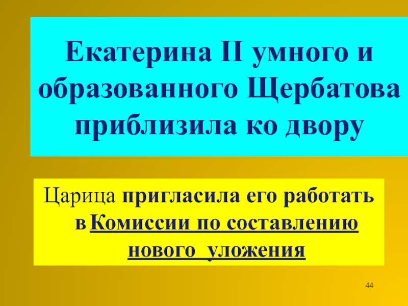 Слайд 44Екатерина II умного и образованного Щербатова приблизила ко двору