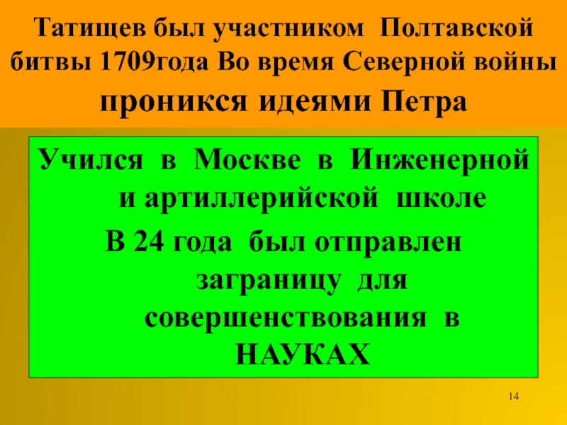 Слайд 14Татищев был участником Полтавской битвы 1709года Во время Северной войны