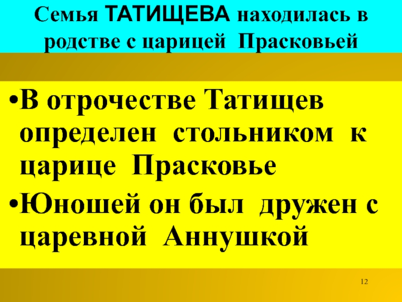 Слайд 12Семья ТАТИЩЕВА находилась в родстве с царицей Прасковьей