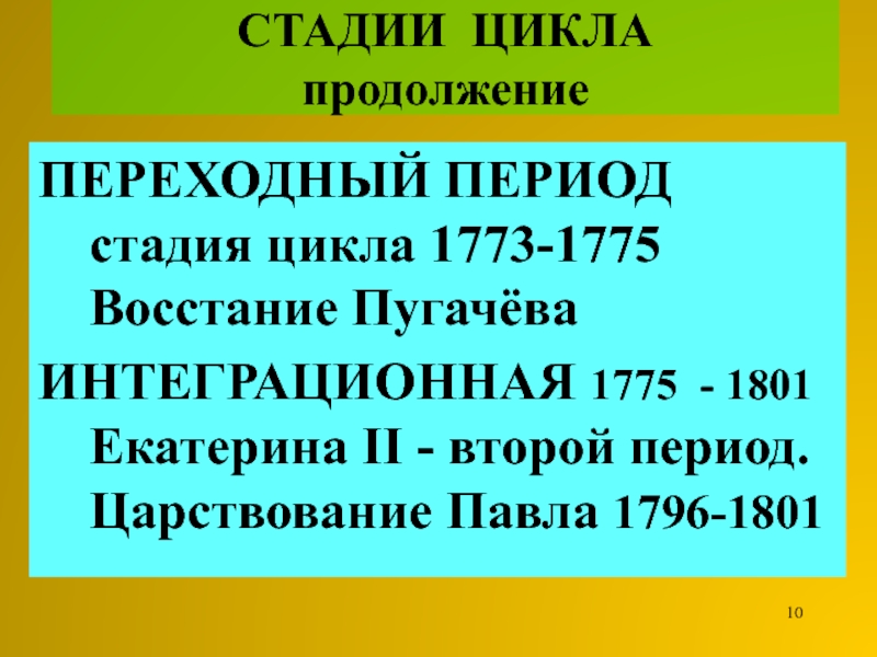 ПЕРЕХОДНЫЙ ПЕРИОД стадия цикла 1773-1775 Восстание Пугачёва
