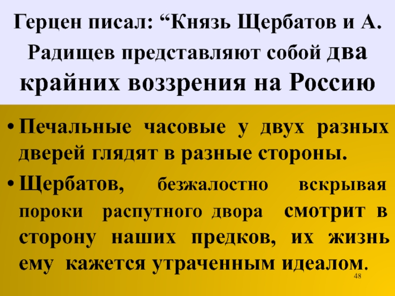 Слайд 48Герцен писал: “Князь Щербатов и А. Радищев представляют собой два