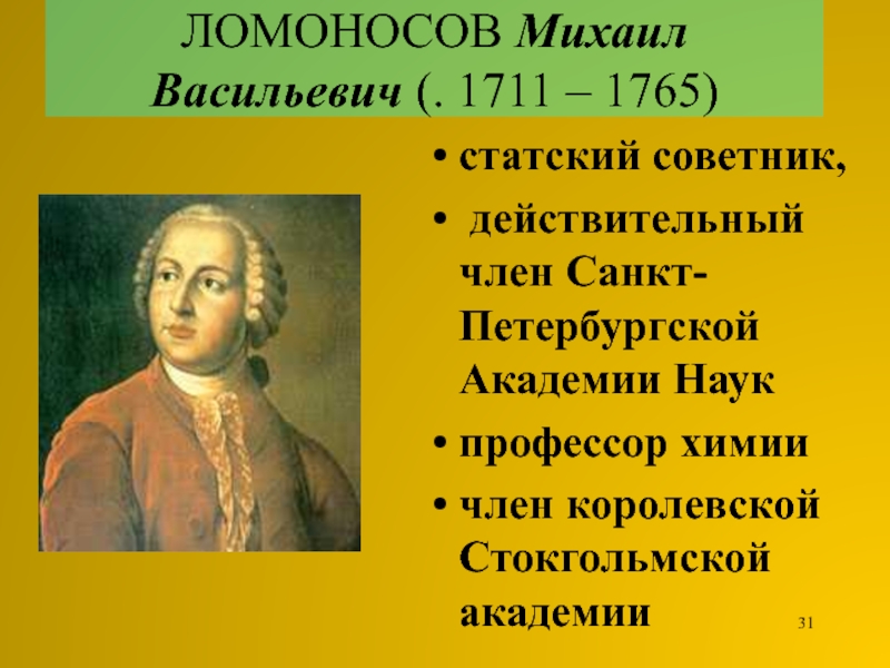 Слайд 31ЛОМОНОСОВ Михаил Васильевич (. 1711 – 1765)