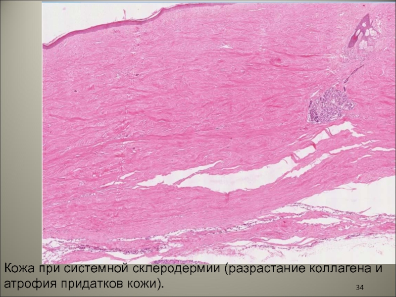 Слайд 34Кожа при системной склеродермии (разрастание коллагена и атрофия придатков кожи).