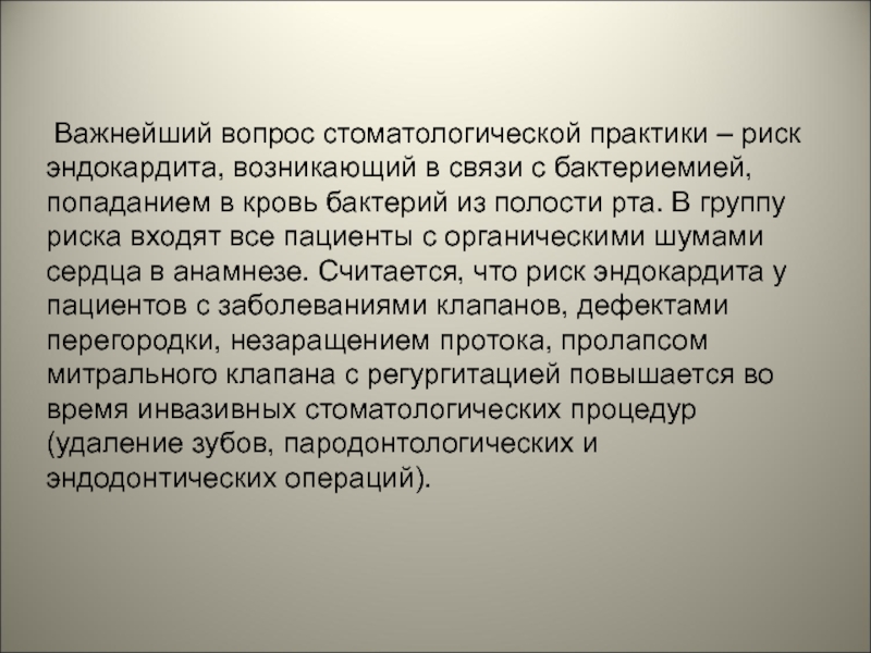 Слайд 48 Важнейший вопрос стоматологической практики – риск эндокардита, возникающий в