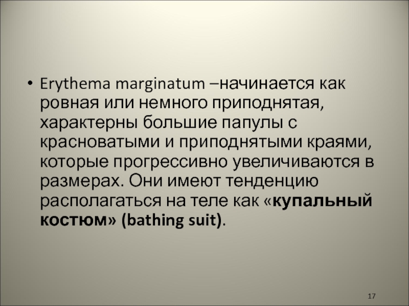 Слайд 17Erythema marginatum –начинается как ровная или немного приподнятая, характерны