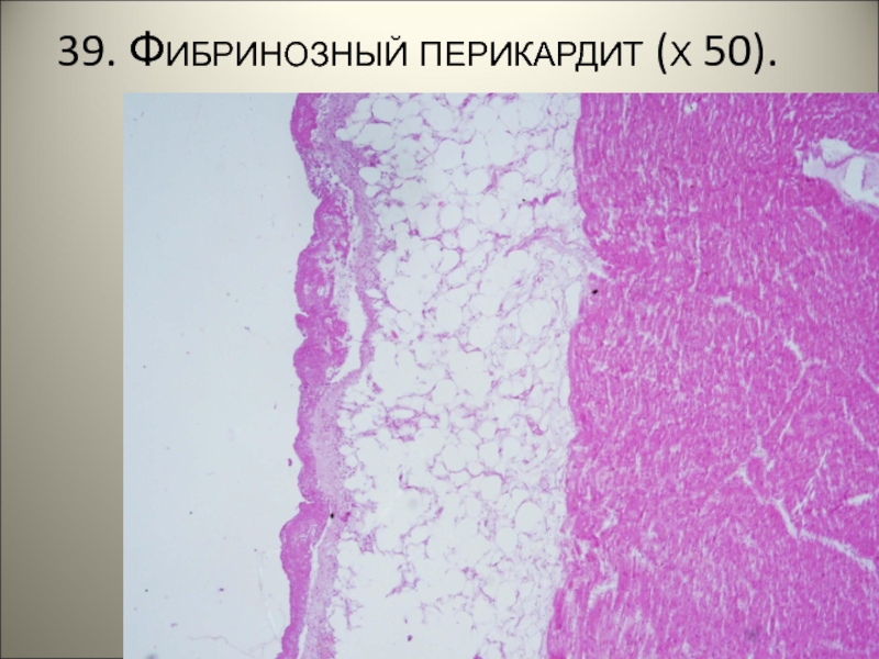 Слайд 5239. Фибринозный перикардит (х 50).