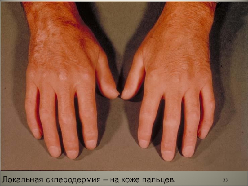 Слайд 33Локальная склеродермия – на коже пальцев.