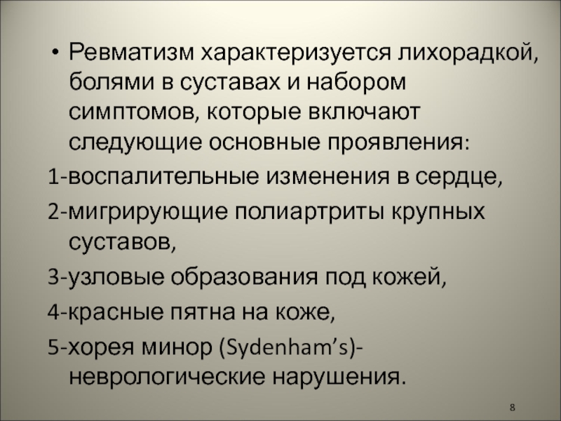 Слайд 8Ревматизм характеризуется лихорадкой, болями в суставах и набором симптомов, которые