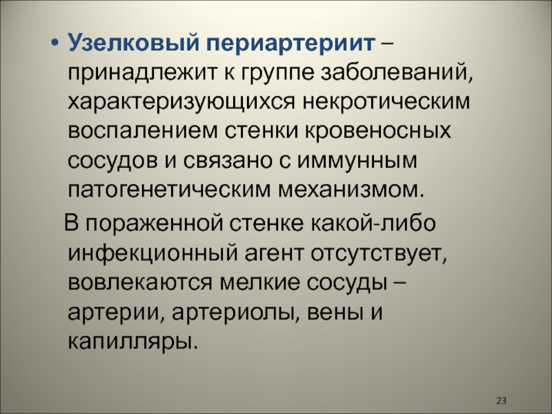 Слайд 23Узелковый периартериит –принадлежит к группе заболеваний, характеризующихся некротическим воспалением стенки