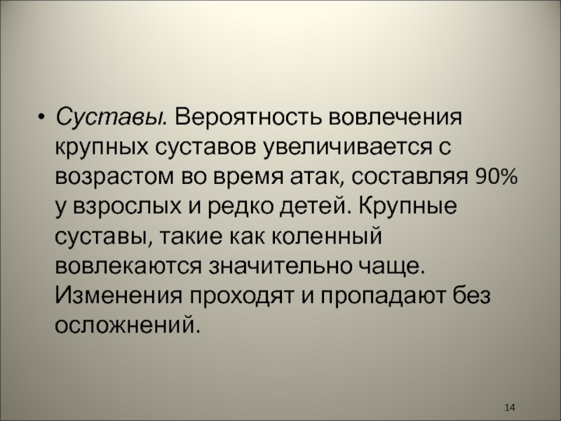 Слайд 14Суставы. Вероятность вовлечения крупных суставов увеличивается с возрастом во время