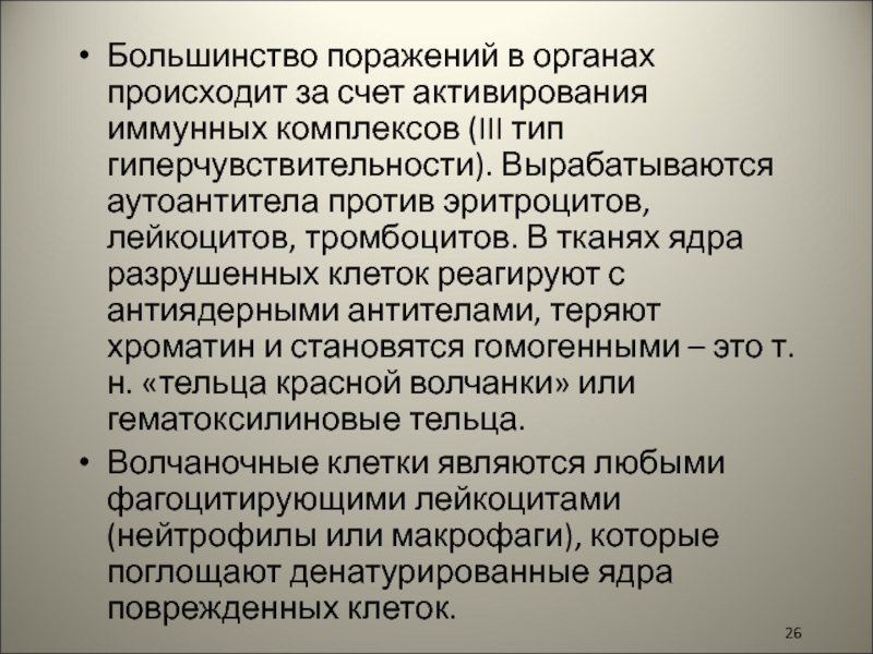 Слайд 26Большинство поражений в органах происходит за счет активирования иммунных комплексов