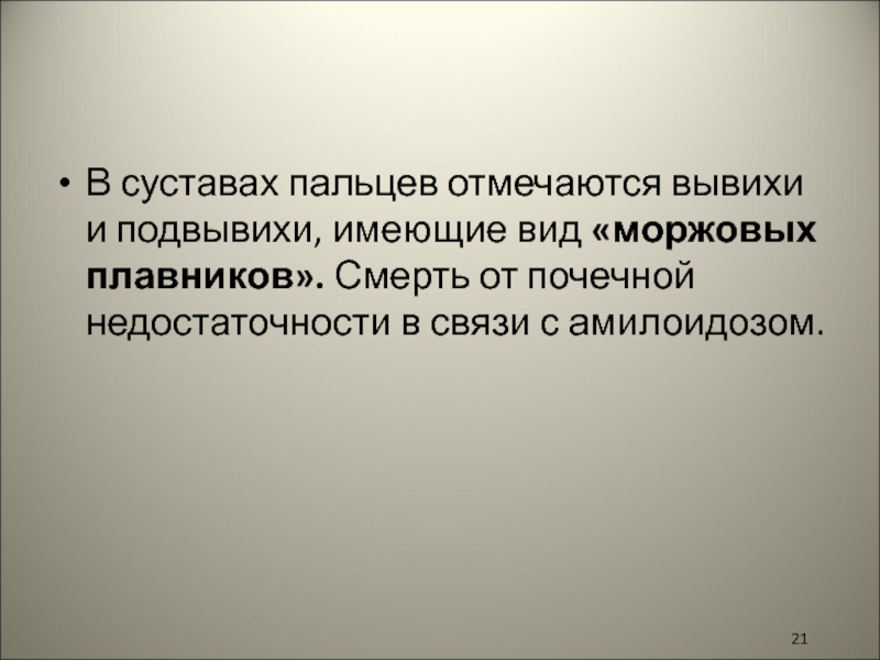 Слайд 21В суставах пальцев отмечаются вывихи и подвывихи, имеющие вид «моржовых