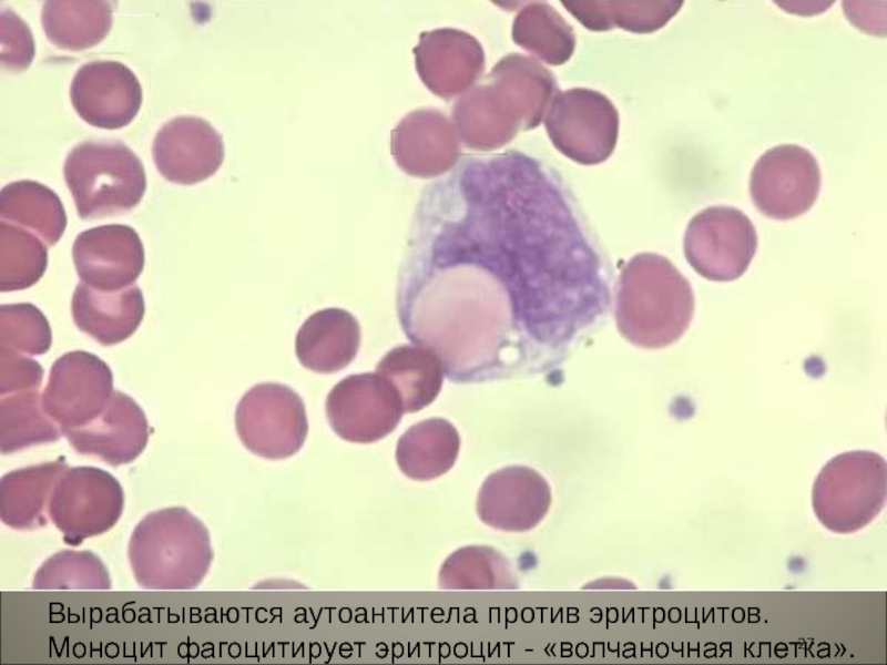 Слайд 27Вырабатываются аутоантитела против эритроцитов. Моноцит фагоцитирует эритроцит - «волчаночная клетка».