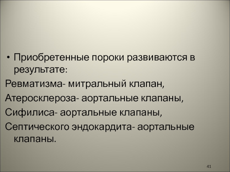Слайд 41Приобретенные пороки развиваются в результате: