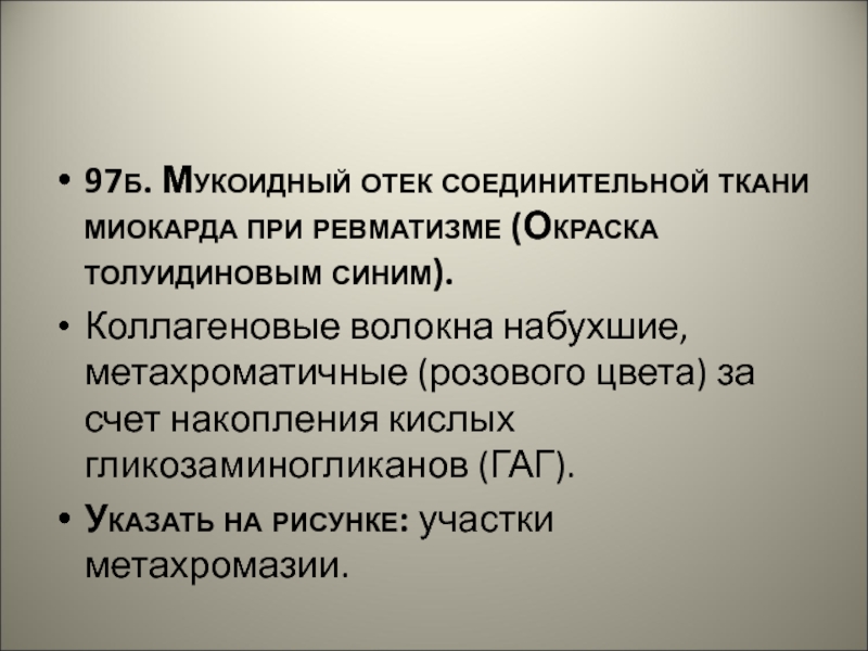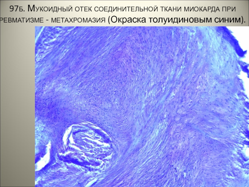 Слайд 5597б. Мукоидный отек соединительной ткани миокарда при ревматизме - метахромазия