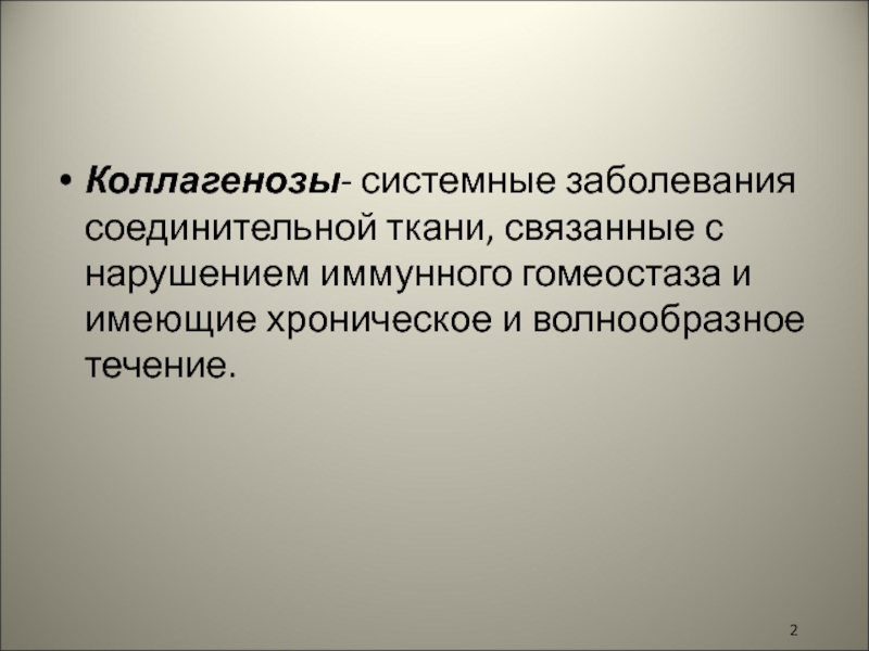 Слайд 2Коллагенозы- системные заболевания соединительной ткани, связанные с нарушением иммунного гомеостаза