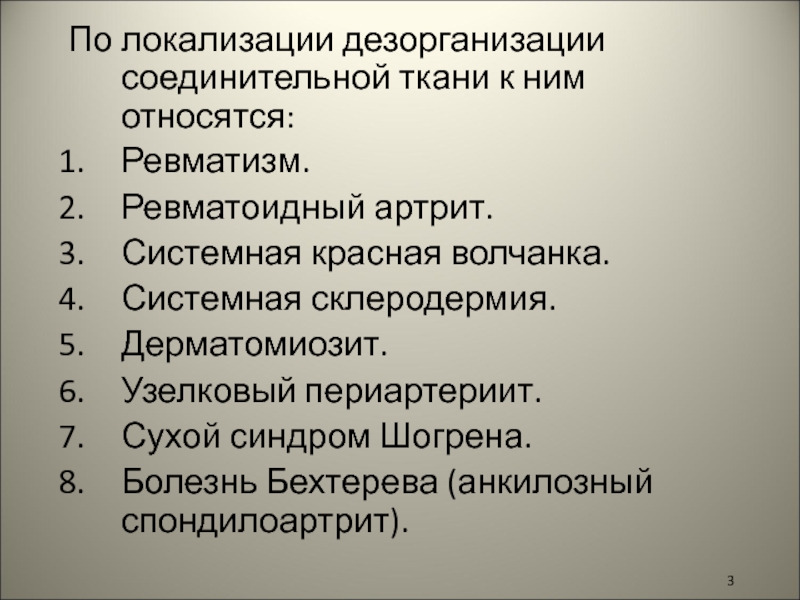 Слайд 3По локализации дезорганизации соединительной ткани к ним относятся: