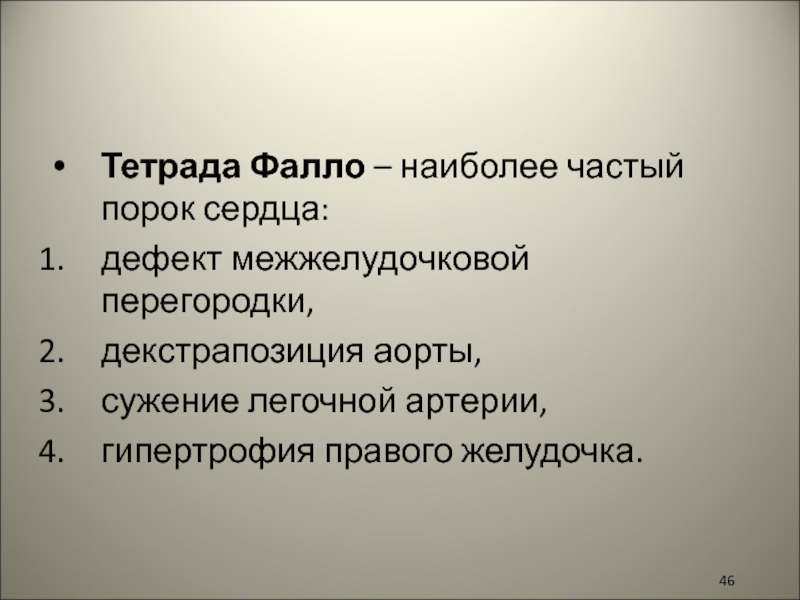 Слайд 46Тетрада Фалло – наиболее частый порок сердца: