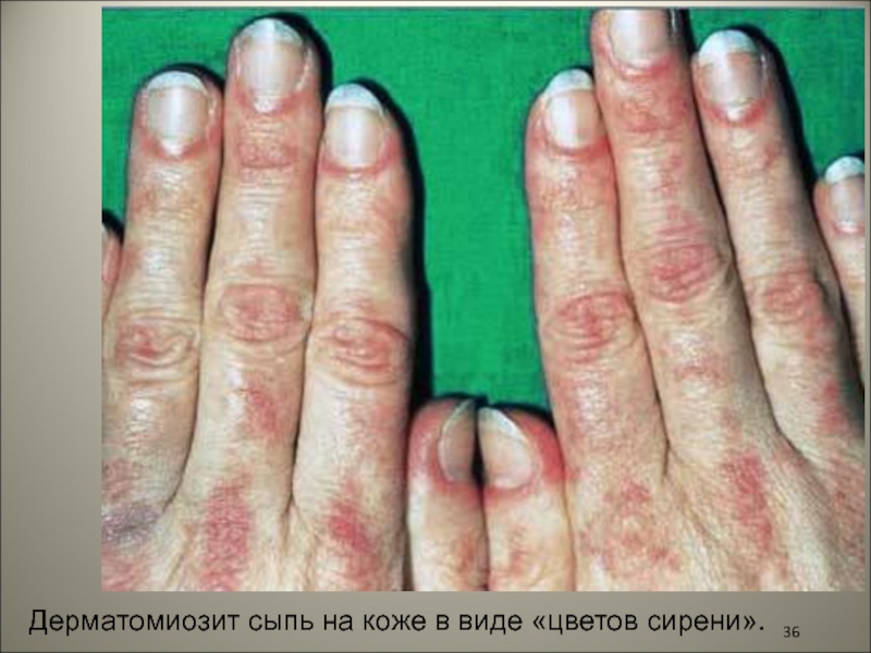 Слайд 36Дерматомиозит сыпь на коже в виде «цветов сирени».