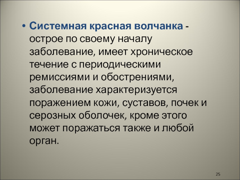 Слайд 25Системная красная волчанка -острое по своему началу заболевание, имеет хроническое