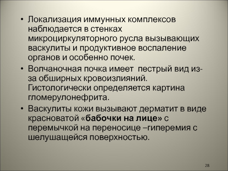 Слайд 28Локализация иммунных комплексов наблюдается в стенках микроциркуляторного русла вызывающих васкулиты