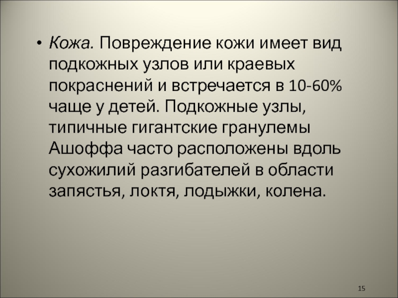 Слайд 15Кожа. Повреждение кожи имеет вид подкожных узлов или краевых покраснений