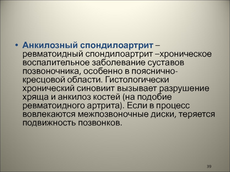 Слайд 39Анкилозный спондилоартрит – ревматоидный спондилоартрит –хроническое воспалительное заболевание суставов позвоночника,