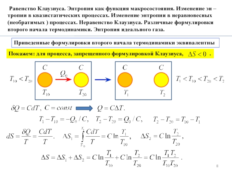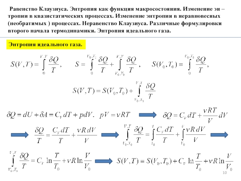 10.3. Равенство Клаузиуса. Энтропия как функция макросостояния. Изменение эн –тропии в квазистатических процессах. Изменение энтропии в неравновесных (необратимых ) процессах. Неравенство Клаузиуса. Различные формулировки второго начала термодинамики. Энтропия идеального газа.
