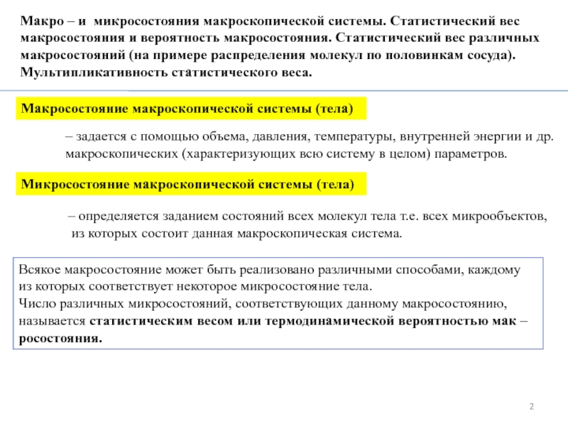 и микросостояния макроскопической системы. Статистический вес макросостояния и вероятность макросостояния.