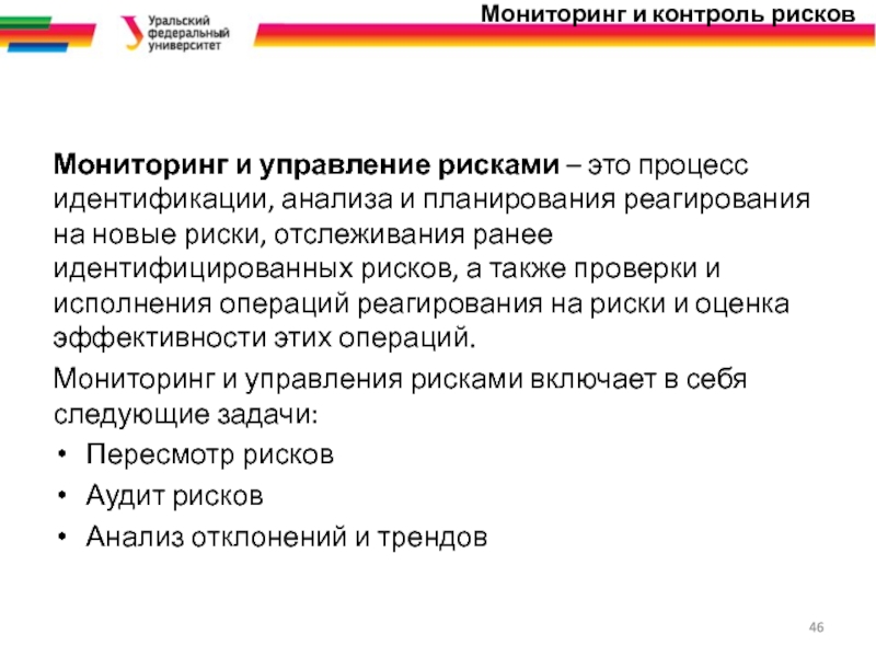 Мониторинг и управления рисками включает в себя следующие задачи: