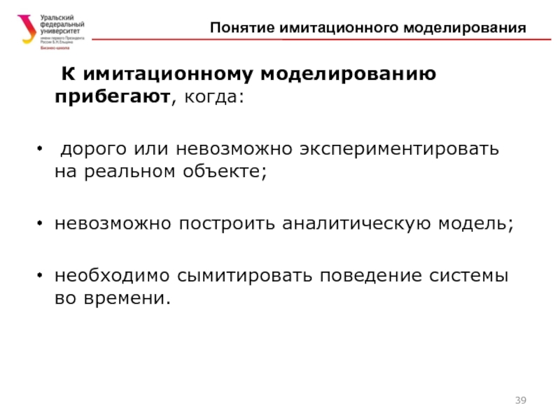 Слайд 39 К имитационному моделированию прибегают, когда: