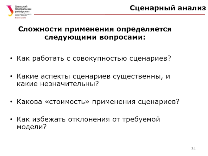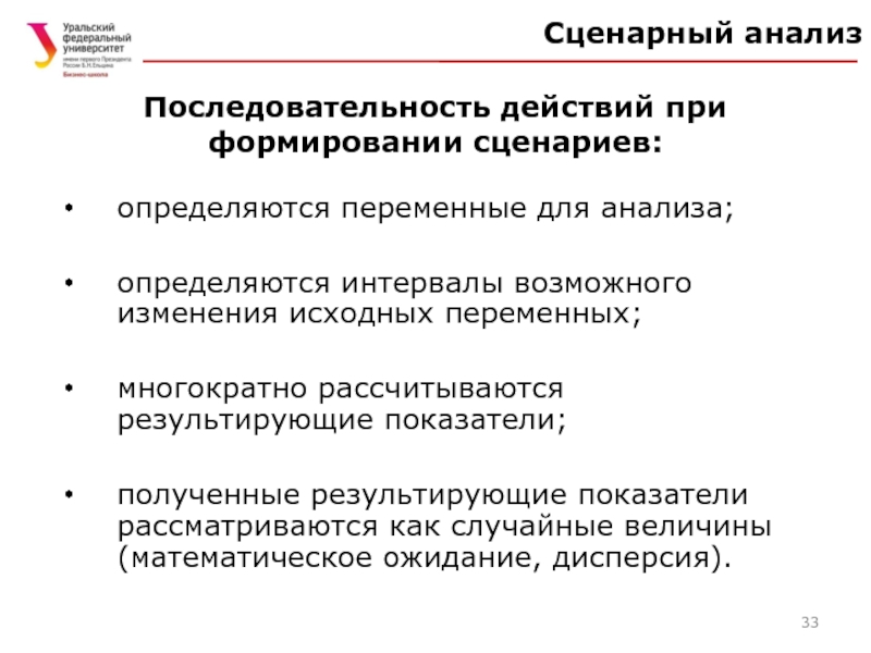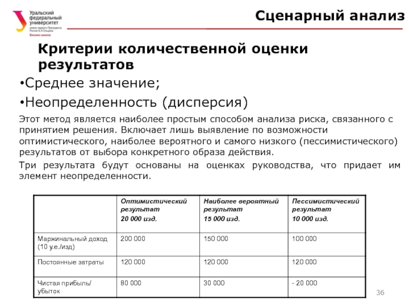 выявление по возможности оптимистического, наиболее вероятного и самого низкого (пессимистического) результатов от выбора конкретного образа действия.