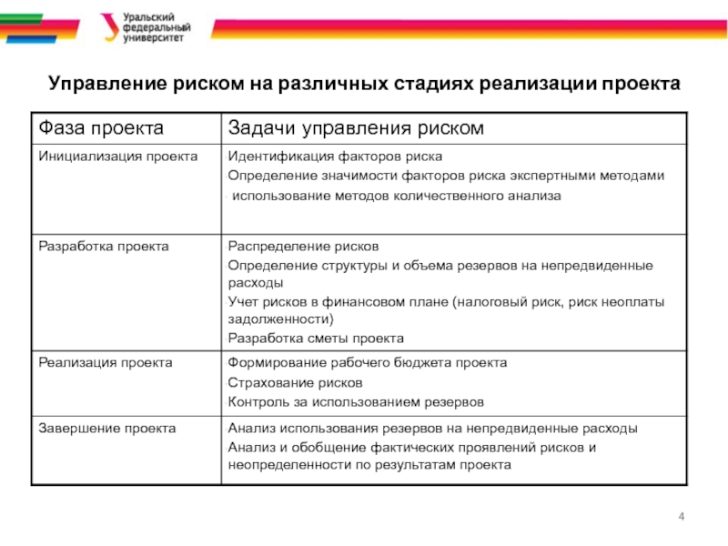 Слайд 4Управление риском на различных стадиях реализации проекта