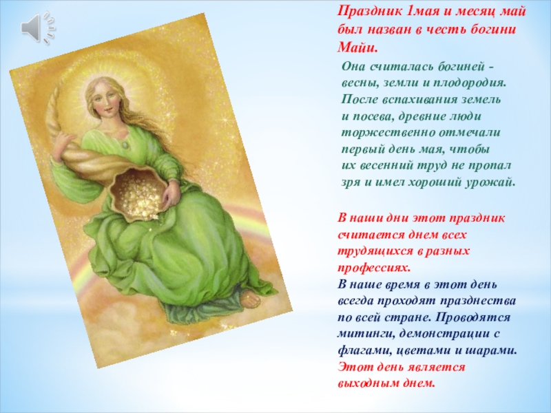 Она считалась богиней - весны, земли и плодородия. После вспахивания земель и посева, древние люди торжественно отмечали первый день мая, чтобы их весенний труд не пропал зря и имел хороший урожай.