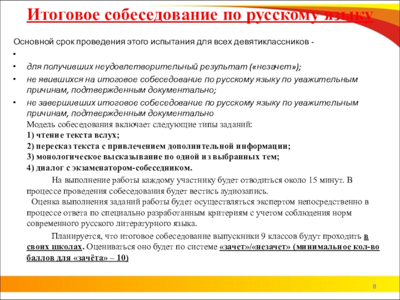 Планируется, что итоговое собеседование выпускники 9 классов будут проходить в своих школах. Оцениваться оно будет по системе «зачет»/«незачет» (минимальное кол-во баллов для «зачёта» – 10)