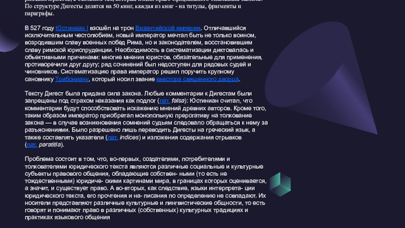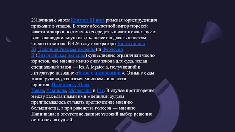 было придано сочинениям(мнениям) Папиниана,Павла,Гая,Ульпиана,Модестина.Каковы причины появления закона?в чем его смысл?3) 3)в 529-533 гг. по поручению византийского императора Юстиниана в целях упорядочения сентенций юристов были составлены Дигесты на основе использования книг 39 юристов. Дигесты состояли из 50 книг. Они были утверждены конституцией императора, и им придана обязательная сила. Конституция об утверждении Дигест запретила какое либо толкование права.