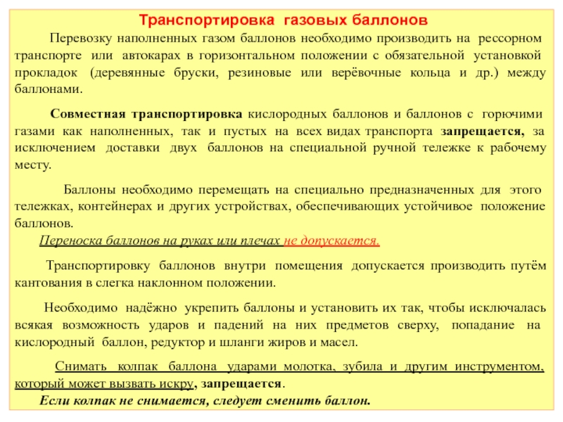 Необходимо надёжно укрепить баллоны и установить их так, чтобы исключалась всякая возможность ударов и падений на них предметов сверху, попадание на кислородный баллон, редуктор и шланги жиров и масел.