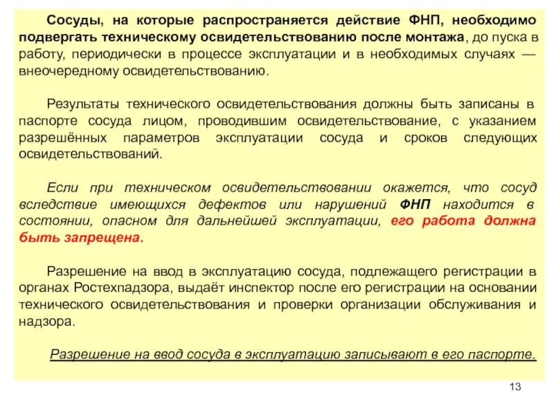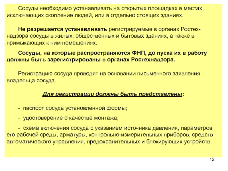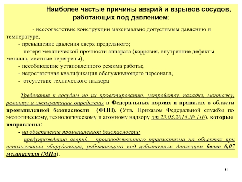 Требования к сосудам по их проектированию, устройству, наладке, монтажу, ремонту и эксплуатации определены в Федеральных нормах и правилах в области промышленной безопасности (ФНП), (Утв. Приказом Федеральной службы по экологическому, технологическому и атомному надзору от 25.03.2014 № 116), которые направлены: