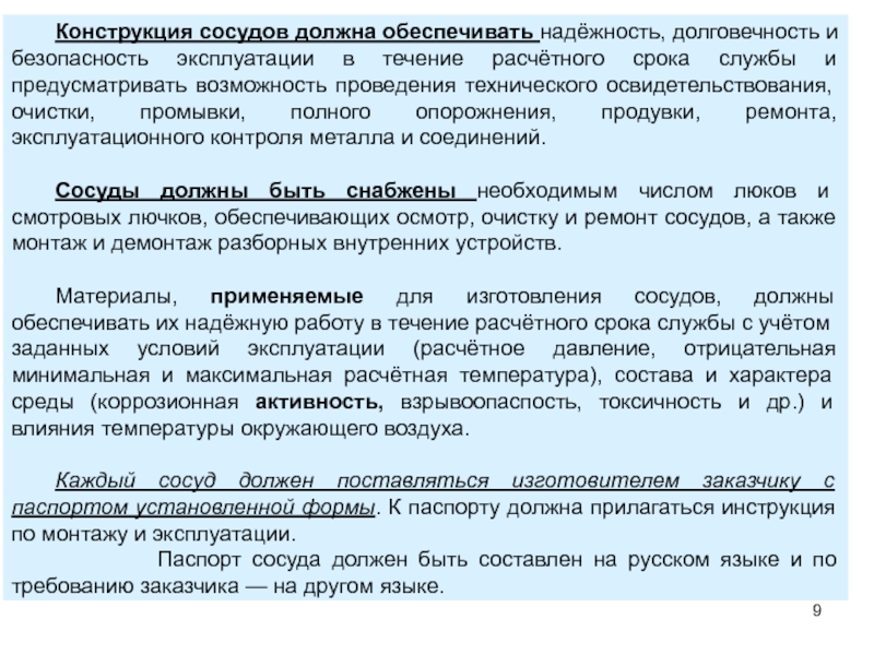Слайд 9 Конструкция сосудов должна обеспечивать надёжность, долговечность и безопасность эксплуатации